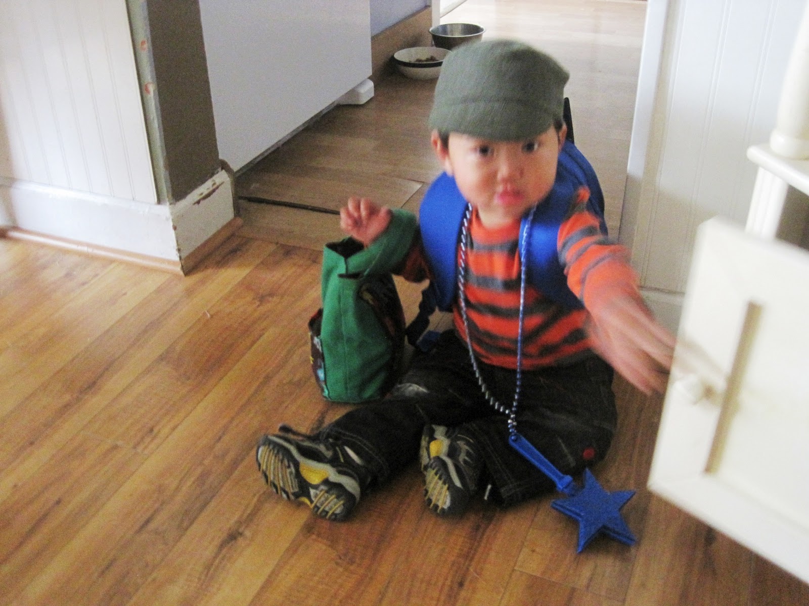 Sometimes, though, TongJie gets his bag and grabs my hand, trying to tell me that he's ready to go somewhere. I know the following photo is a little blurry, but TongJie was walking around the house with his bag, his backpack, and his hat, as well as his clapper necklace thing that he uses as a microphone. He was REALLY ready to get out and do something important!